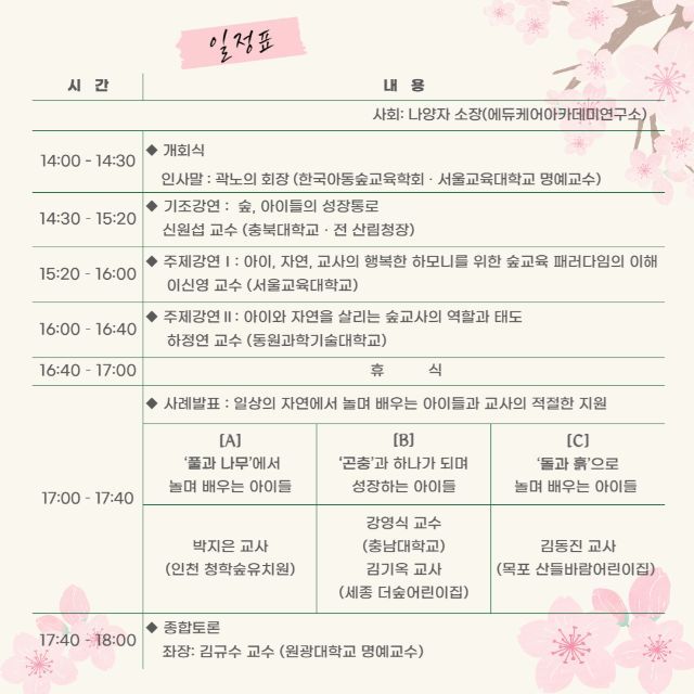 안녕하세요. 에듀케어아카데미입니다. 일상의 풀과 나무에서 놀며 배우다. ‘아이, 자연, 교사’가 만드는 행복한 하모니를 실천 사례와 함께 나누며 현장 적용력을 높이는데 도움이 되고자 춘계학술대회를 개최합니다. 양질의 보육환경을 구축하는 데 앞장서가고자 에듀케어아카데미가 후원을 진행합니다. ▶온라인 춘계학술대회 지금 바로 신청하기 https://forms.gle/kGnuZ2E6F92x7TQu5 (접수기간 : ~ 05월 25일) [학술대회 일시 및 개요] □ 주제 : 아이, 자연, 교사의 행복한 하모니 : 일상의 풀과 나무에서 놀며 배우다 □ 일시 : 2022년 05월 27일(금) 14:00 ~ 18:00 □ 주최 : 한국아동숲교육학회 □ 장소 : 굿티처스튜디오(온라인 개최) □ 후원 : 에듀케어아카데미 □ 자료집 다운로드 및 이수증 발급안내 * 5월 26일 목요일 오픈예정 * □ 등록안내 참가비 : 10,000원(자료집 pdf포함) 국민은행 578601-01-284598 예금주 한국아동숲교육학회 *입금자명 반드시 이름 + 소속 예) 김아동 숲어린이집 ☎ 문의 - 정세희 간사 010-2442-1098 / k-forest-edu@naver.com ※ 학술대회 세부일정 및 학술대회 등록방법은 하단의 첨부된 파일을 확인해주세요. ![]() ![]() ![]() |