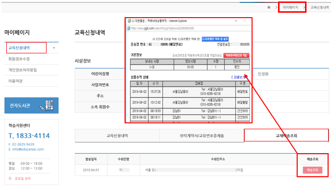 에듀케어아카데미 교재배송 안내드립니다 . 교재배송은 교육시작일 기준으로 최종인원 확정 후 첫째 주 일괄 배송됩니다 . ※교재 배송 전 : 로그인 > 나의강의실 > 자료실 >통합교안 다운로드 받으셔서 수강진행하시면 됩니다 . 교재는 CJ대한통운 택배 로 배송되며 , 어린이집으로 일괄 배송하오니 참고하여 주시기 바랍니다 . <교재 배송상태 보기 > *배송상태보기 : 에듀케어아카데미 로그인 > 마이페이지 > 교재배송조회에서 확인가능합니다 . 감사합니다 . |
